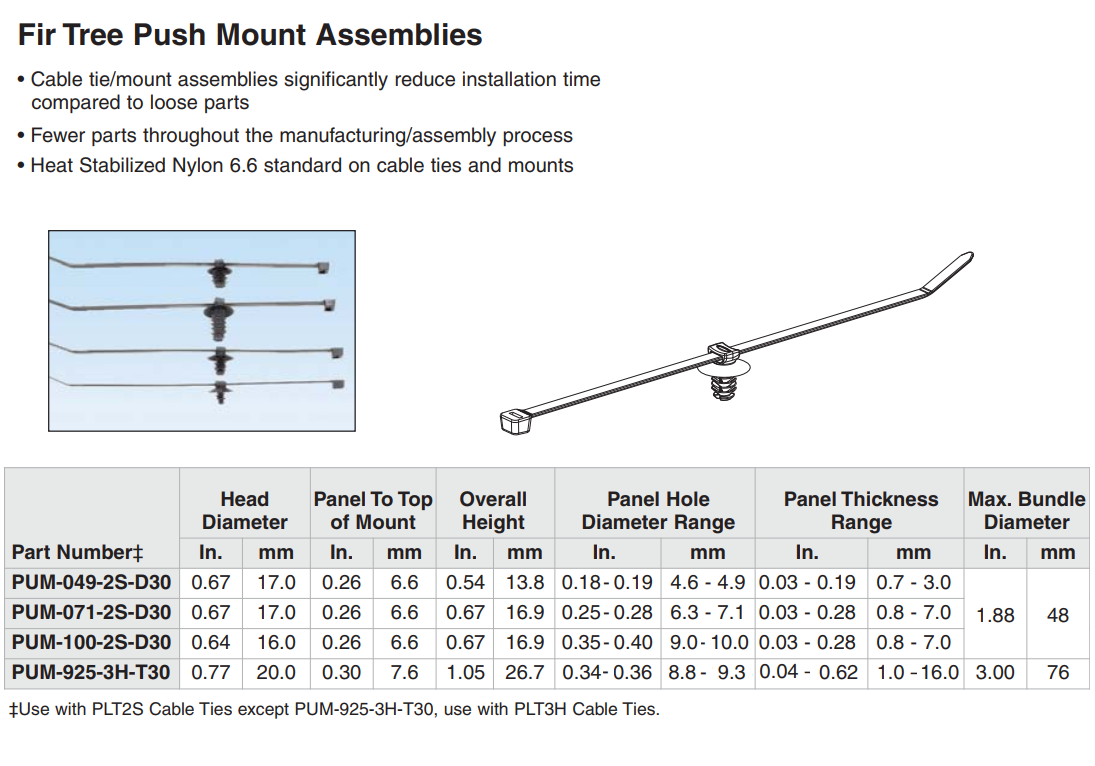 PANDUIT泛達樹形推式固定座可提高保持力,同時降低插入力,是一款理想的解決方案。 適合固定用于汽車、船舶、白色家電、重型設備和軌道交通市場的線束。 此組件的兩個系列扎帶最大線束直徑分別為 1.88 /3.00英寸(48 /76 毫米),面板孔直徑范圍為 0.18-0.40 英寸(4.6 -10.0毫米)。 由熱穩(wěn)定尼龍 6.6 制成,滿足高溫應用的需求。